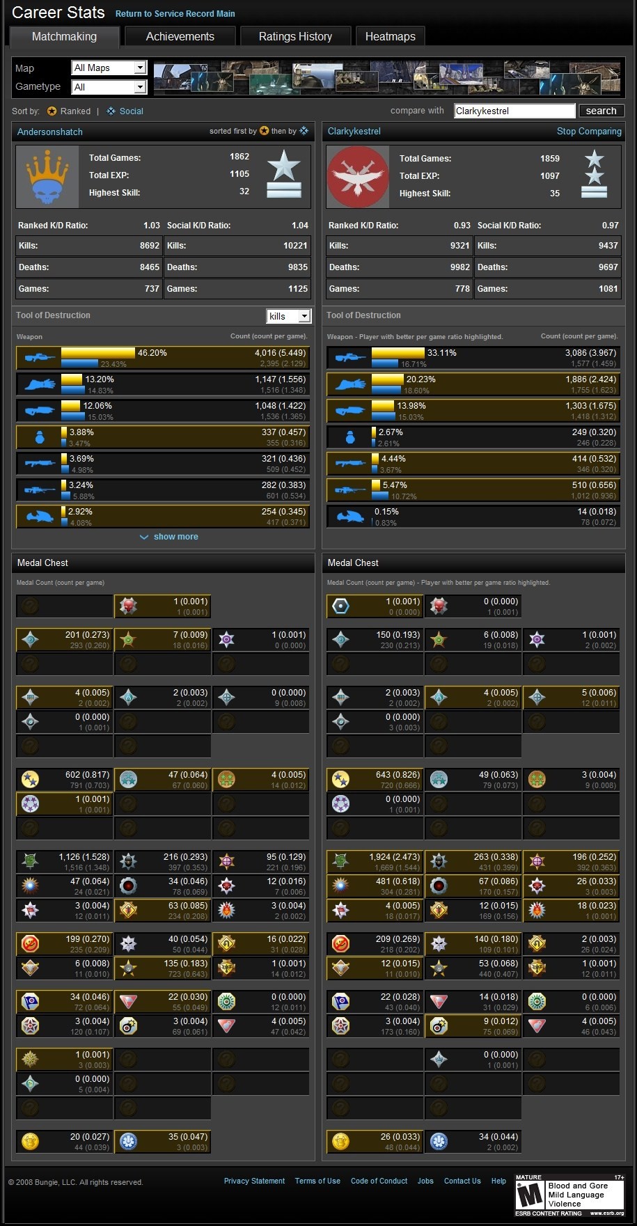 Bungie.net has had a few upgrades as of today. For instance, now both ranked and social kills by weapon etc. are shown on one screen and you are able to compare your career stats with someone else’s. (as shown in the picture)